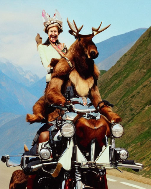 Queen Elizabeth riding a motorcycle through the Himalayas with a moose on the back.